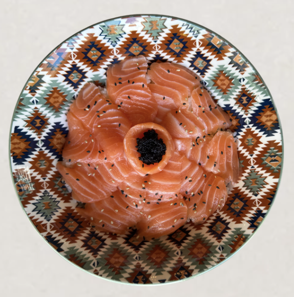 Saumon, riz, tobikko oeuf, gingembre, wasabi / Salmon, rice, tobikko eggs, gingembre, wasabi