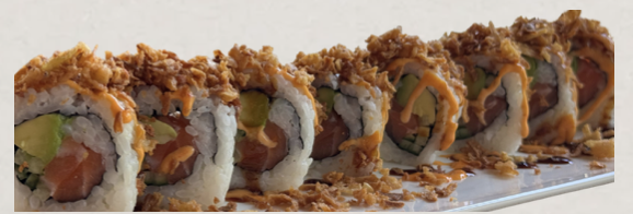 Riz, feuille d’algue, saumon, avocat, concombre, oignons frit / Rice, seaweed sheet, salmon, avocado, cucumber, fried oignons
